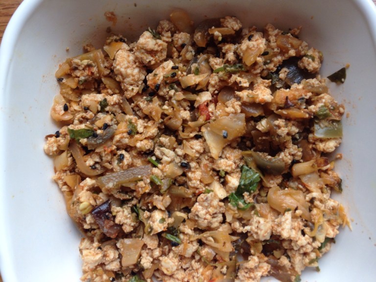 New year start with some good weather for East coast, then big storm dumping 2 feet of snow in one day. When there is storm in winter means no going out, come up with some new recipie to try as i cook and watch snow falling from my kitchen. I like to make tofu sandwich, stir fry it, one time I made tofu fritters taste like cheese pakora. This is my family’s favorite to make it with lot of onions and good masala taste with fennel seed powder. You need to microwave tofu for 2 minutes to take the raw smell out. Cabbage adds a sweeter taste to it, fennel seed powder enhance the flavor over all. You can make a nice toasted sandwich with this, or can have it over brown rice, quinoa or boiled millet.