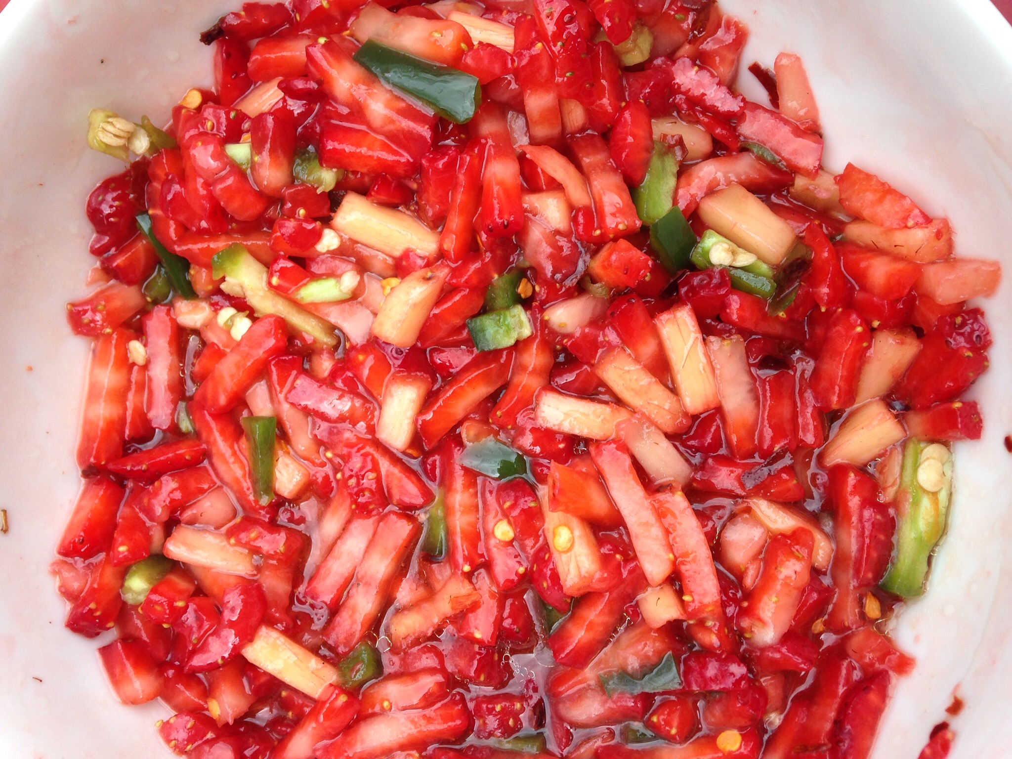 Wash and chop strawberrys, peel the skin of ginger and chop. Mix strawberry and ginger in bowl and add all the remaining ingredients and stir it nicely, taste it if you need to add more sugar or salt or more jalapeño do that and put in a jar let it sit for 30 minutes for the flavors to mingle. This is good relish for your fish or chicken or just eat with plain rice.